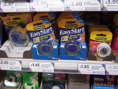 セロテープってのはニチバンの商品名で製品自体はセロハンテープというのだ、と昔教わった記憶があるのだが、イギリスには。。。
