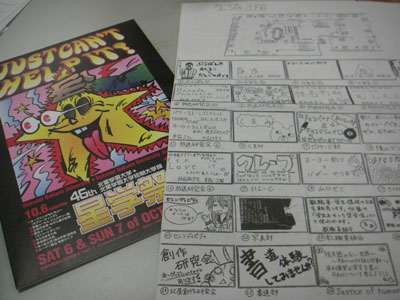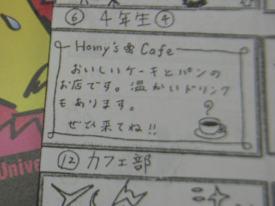 ただ楽屋にあったこのパンフレットを見てて思ったんですが、何故か「放送研究会」というサークルは、このサークルだけで7軒もの模擬店を出している!それも放送に関係あるものは特になく、普通にクッキーやらパワーストーン(?)やらを売る店や、イラストだの姓名判断とかの文字が見える。このサークルは物凄く部員の多いマンモスサークルなのでしょうか?それともこの学園祭において妙に張り切っちゃってる勘違いサークル?謎は深まるばかりです。そういえば模擬店といえば体育会系のサークルがよく食べものの模擬店を出してるものですが、ここの大学は珍しく体育会系のサークルの模擬店はいっこも無かったような気が。。。
