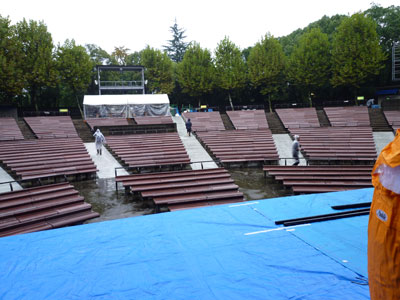 私、恥ずかしながら今まで日比谷の野音でステージに影響するような雨が降った経験がまったくありませんでした!晴れ男を自称しておりまして、実際LUNA SEAという天候に恵まれないバンドを担当していたときも野外ツアーなのに一度も雨が降らなかったのでメンバーに感謝されたくらいです。しかし、そんな雨初体験が台風直撃っすよ(笑)いよいよ晴れ男の看板を下ろすときがきたのかな〜。。。