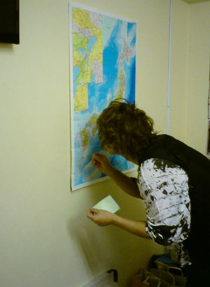 11月29日の広島の本番日には、地理に弱いメンバーの為に会場入りの前に日本地図を探して町をぶらぶら。。。でもちょうどいい地図ってなかなか売っていないもので、あきらめかけたその時!なんと「地図専門店」を発見!無事に日本地図を購入して楽屋の壁に貼りますと。。。