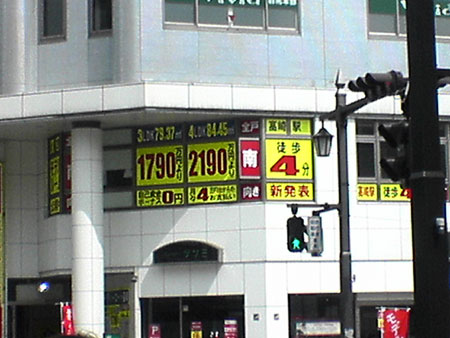 16日は車に乗って高崎に行って参りました。関越が事故渋滞で所沢まで1時間もかかってイライラしつつも30分前には高崎CLUB FLEEZに到着。搬入に使うエレベーターの前に車を止めるとちょうど目の前の道のトイメンに不動産屋さんらしき看板が。。。