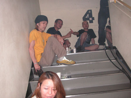 しょうがないので階段でたむろするスタッフチーム。ちょっとガラ悪い?