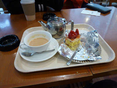 カフェでお茶して時間潰しですわ。