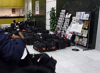 トラックから大量のバッグが下ろされてる最中。